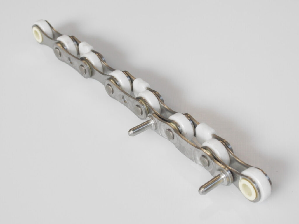 Bottle washer chains require high strength and long wear life without lubrication. For part of the bottle washing process the chain works immersed in water with diluted detergent and is often polluted by abrasive elements from the glass bottles, like dust and paper residues.